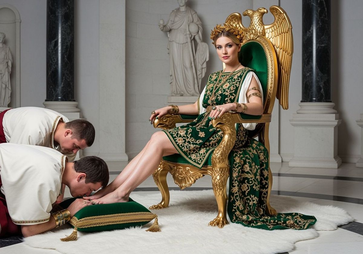 This image shows a Roman Empress regally seated on an ornate throne, barefoot, as senators pay homage. The scene is set in a grand marble palace, captured with professional photography techniques and natural lighting.