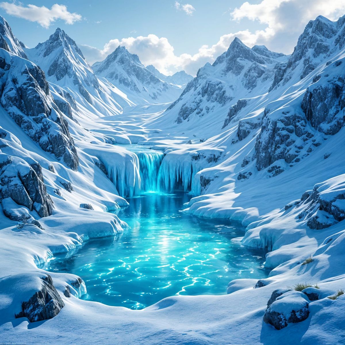 This image showcases a magical spring nestled in a frozen mountain valley, rendered with epic 3D game graphics and dynamic lighting for a stunning visual experience.