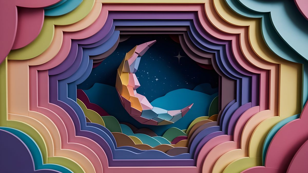 This visually striking painting showcases a miniature nighttime landscape illuminated by a colorful paper crescent moon, featuring layered geometric shapes and warm, inviting hues.