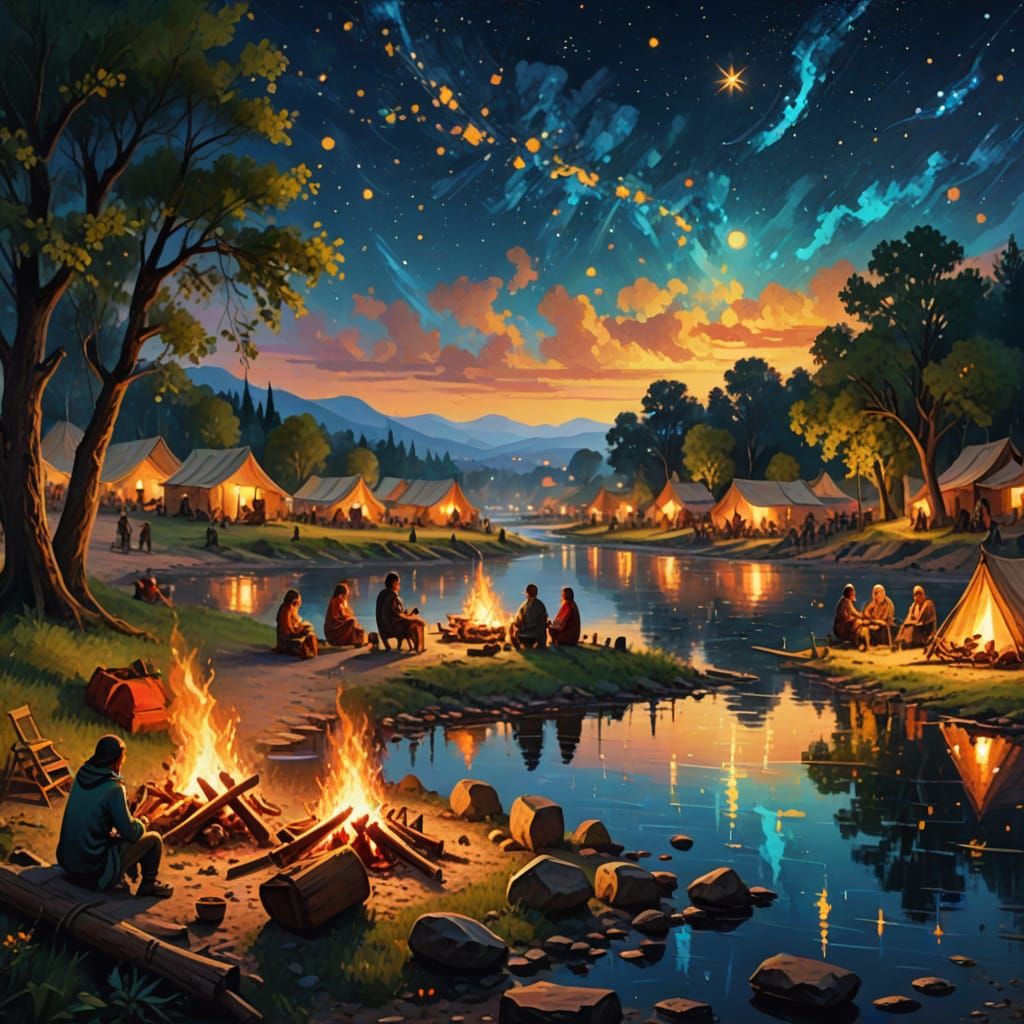 This image shows a serene gypsy camp by a river, bathed in warm golden light and vibrant colors, with a twinkling campfire and starry night sky, capturing a free-spirited and joyful atmosphere in an oil painting style