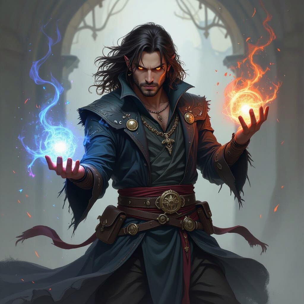 A dramatic image of an angry half-elf warlock in mystical clothing. The artwork features dynamic brushstrokes and atmospheric lighting with vibrant colors, in a fantasy art style.