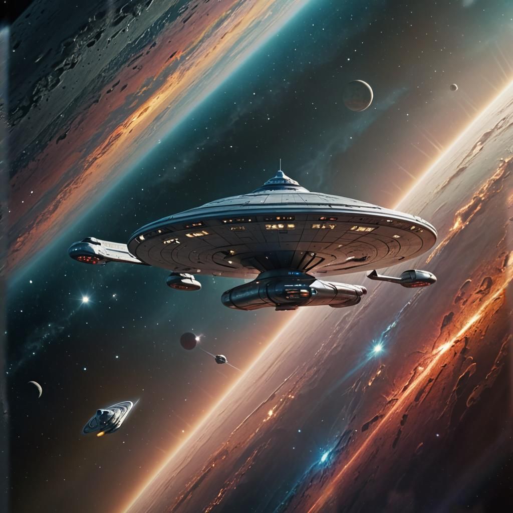 This image shows a photorealistic depiction of the iconic original space ship Enterprise from the 1960s Star Trek series. A nostalgic illustration of a bygone era in space exploration, featuring a classic Starfleet vessel in stunning detail.