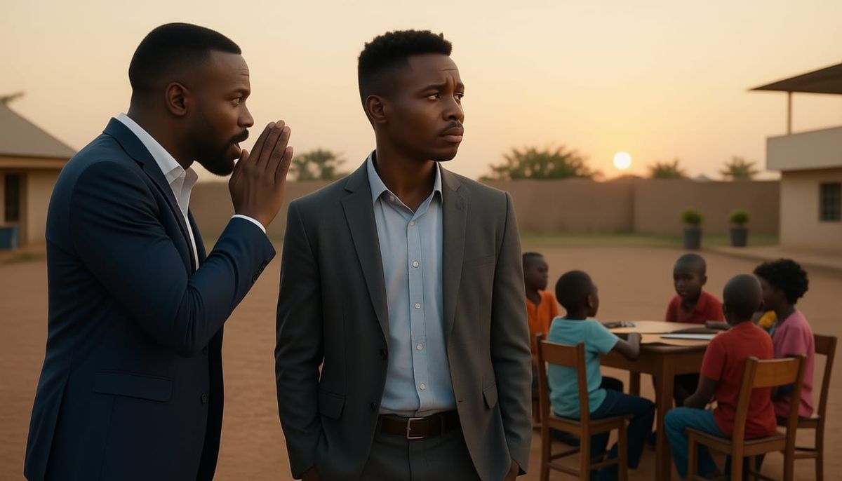 Ultra-realistic cinematic image, advanced mode 100%. Outdoor Abuja setting, daytime. Ethan (21) standing beside a wealthy businessman who is talking to him. Ethan’s head slightly turned, his EYES clearly looking at Ariel, not at the businessman. The businessman’s mouth is open mid-speech, gesturing confidently. Ariel (21) is a short distance away, teaching children, smiling with purpose. Strong eye-contact connection from Ethan to Ariel — clear, intentional, emotional. No eye contact between Ethan and the businessman. Natural African features, realistic proportions, sharp focus. Cinematic depth of field, emotional tension between temptation and purpose.