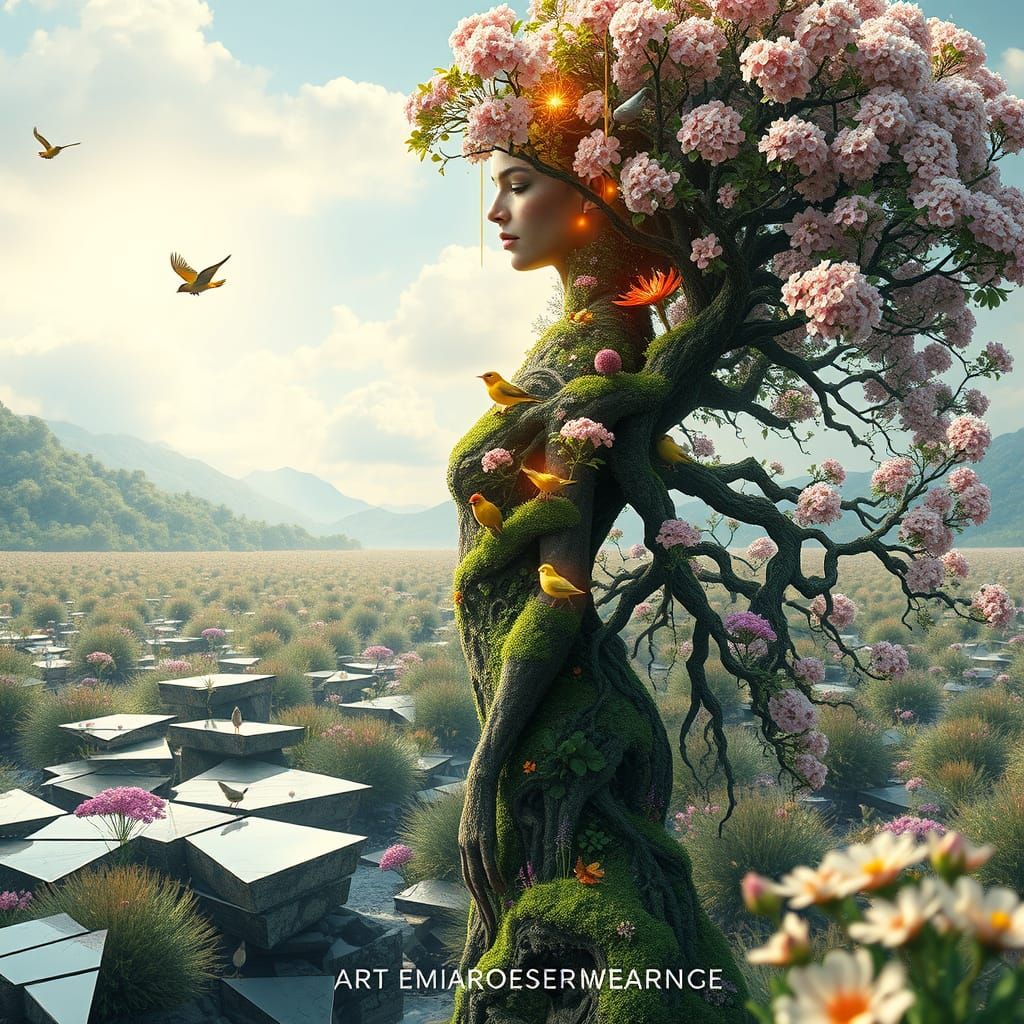 This image depicts a mystical being, a hybrid creature with the head of a woman and the body of a blooming tree, standing in a serene springtime environment. She embodies the principles of the Rainbow Body, a symbol of power and love, and represents the connection between humans and nature.
