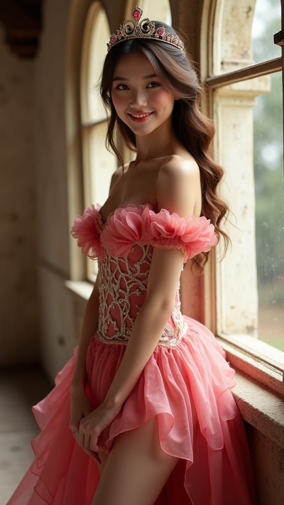 A realistic photograph captures a smiling princess with a tiara, wearing a short, off-shoulder baroque-style dress in red, pink, and white, standing elegantly by arched windows with dramatic, soft lighting.