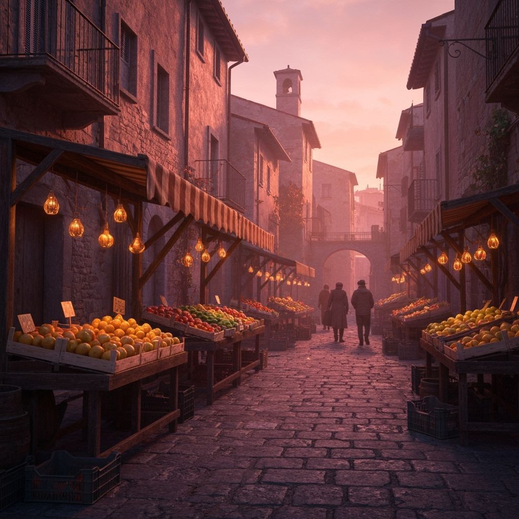This image shows a fruit and vegetable market in a small Italian village, lit by the warm, pinkish light of the setting sun. Stalls glow with golden colors in a vibrant digital painting.