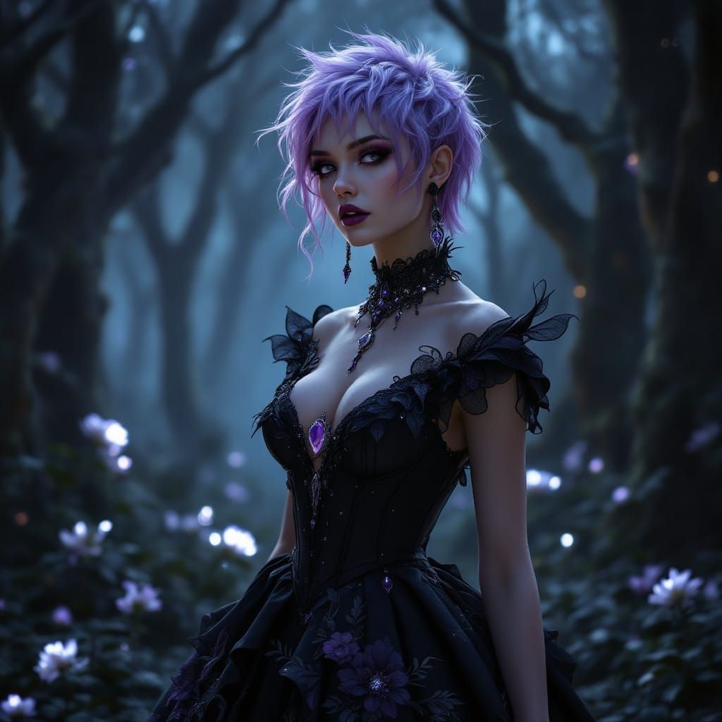 A stunning hyperrealistic gothic woman stands amidst a magical bioluminescent forest, her lavender hair and matching ballgown shining in the night. Inspired by Art Nouveau masters, this enchanting scene embodies fantasy realism.