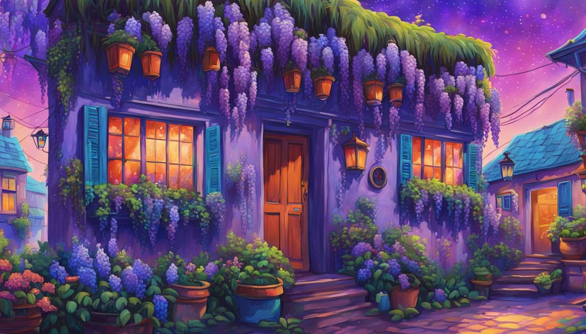 A hyperdetailed digital painting of a village street featuring magical potted plants and buildings draped in wisteria, under violet skies. Rendered in a gouache style with melting lights.