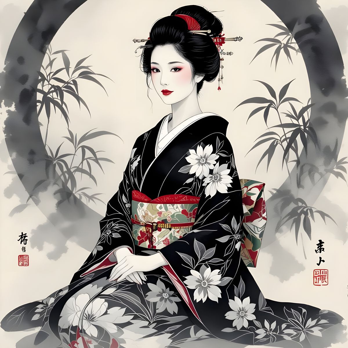 A serene woman in a kimono with black and white patterns is depicted in this image. The artwork blends Japanese aesthetics with contemporary art, using watercolor and ink techniques for soft textures.