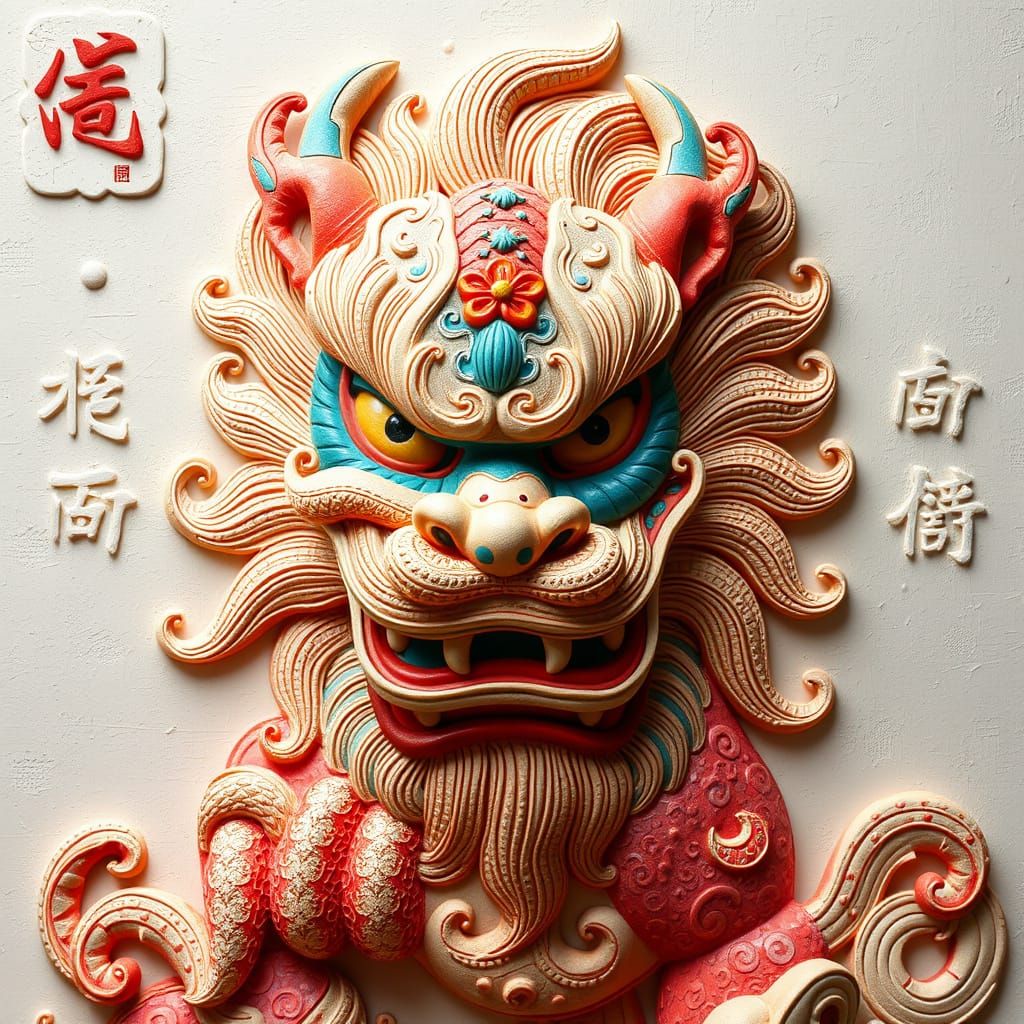 A vibrant, high-definition image of a Chinese lion in bas-relief. The artwork blends realism and symbolic motifs in a style reminiscent of traditional Chinese art.