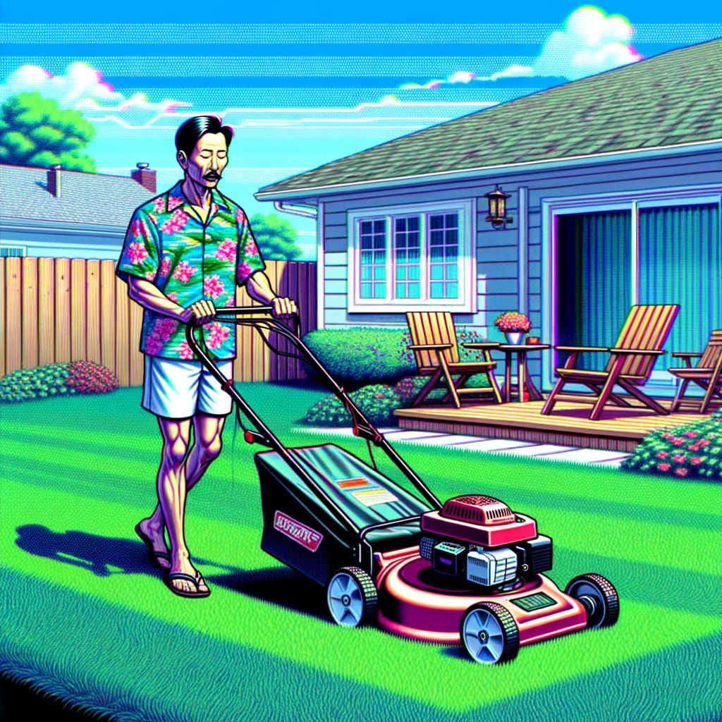 This image shows a glitch in reality as a suburban dad mows his lawn. The scene has a cartoonish style reminiscent of 90s retro animation, with a digital corruption effect.