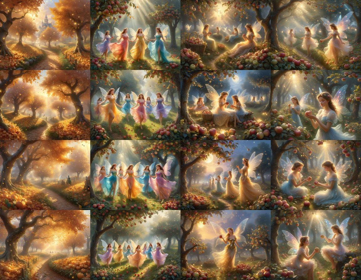 This image showcases a hyperdetailed, mist-filled orchard with radiant, glowing apples. Beautiful fairies in gossamer attire are depicted harvesting the ripe fruit in an ethereal fantasy style.