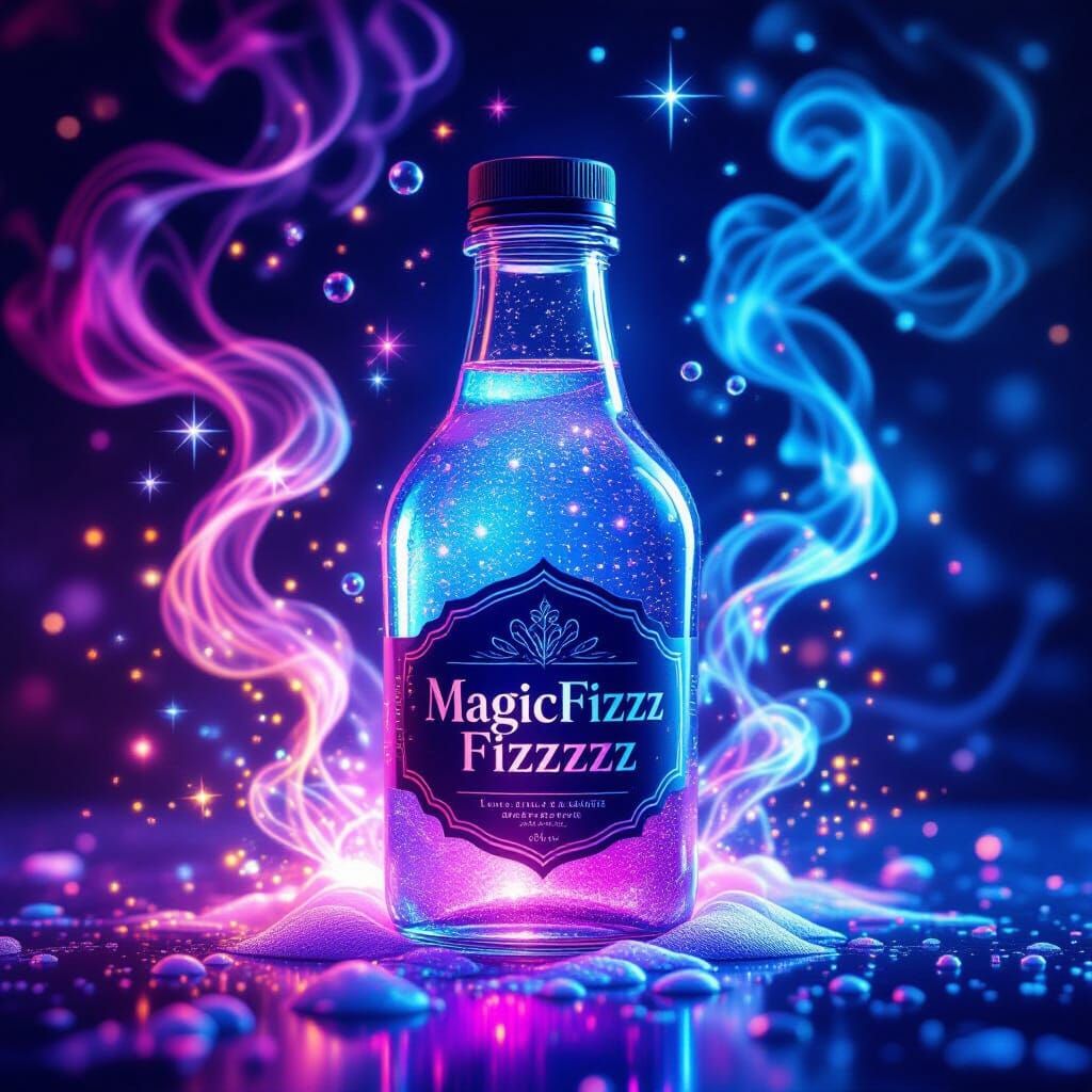 This image shows a realistic bottle named MagicFizz, filled with neon fizzy liquid and emitting shimmering bubbles and light in a dreamlike atmosphere. Photorealistic, macro lens, bokeh.