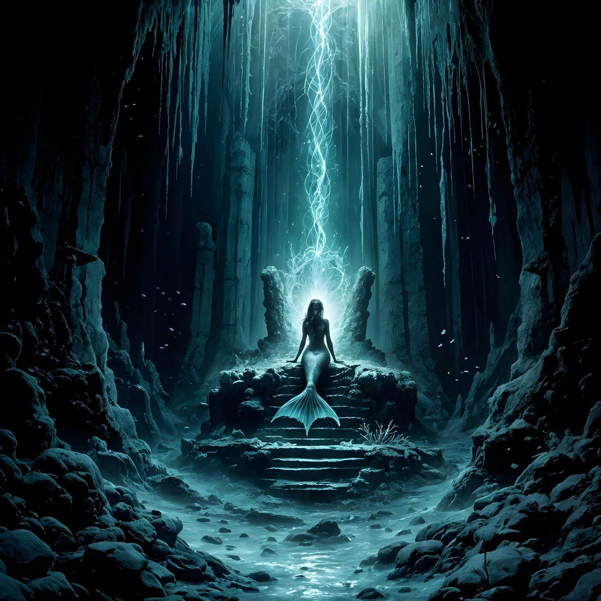 This dark fantasy comic illustration shows a lone mermaid princess on a throne of ruins in a deep abyss, illuminated by cosmic light and strange sea creatures. It features a muted, deep-sea color palette and atmospheric feel.
