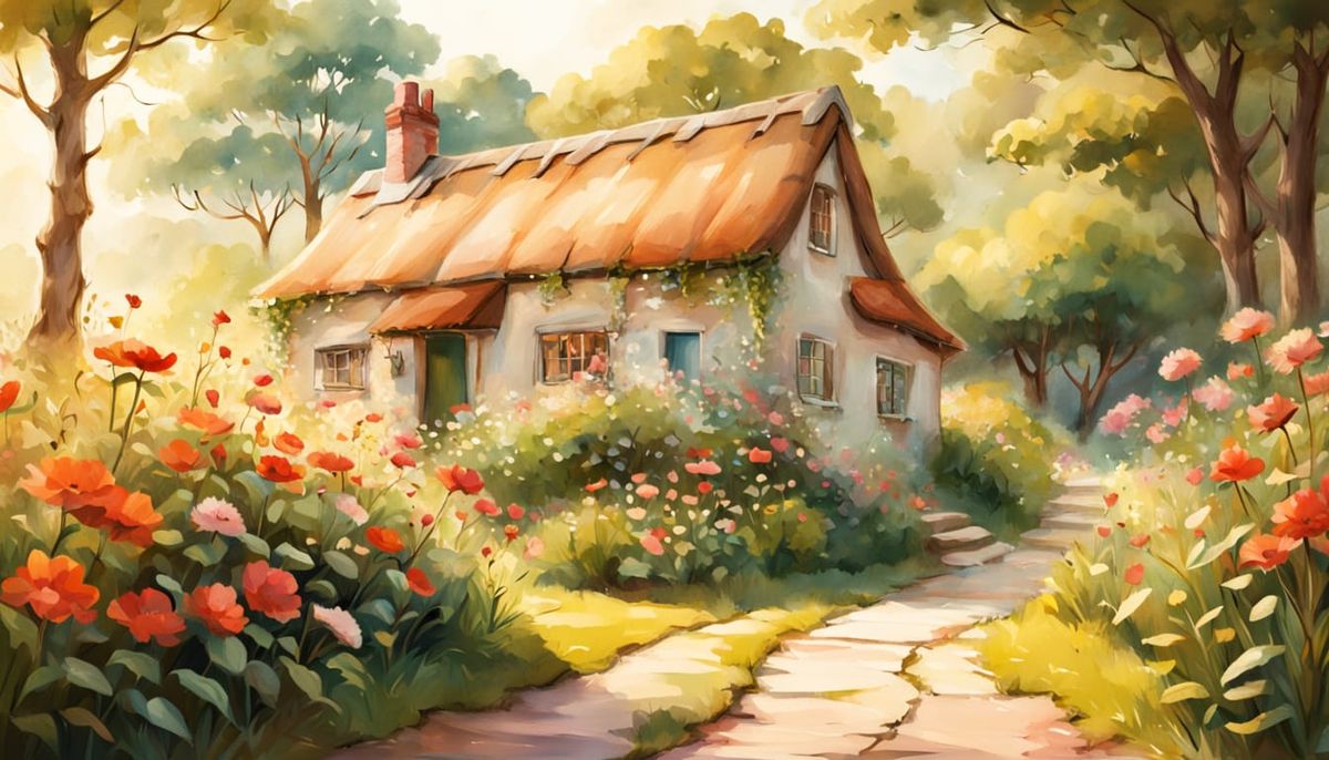 This image shows a quaint, thatched cottage nestled in a lush garden with a red roof and vibrant flowers. A path leads to a small rowboat by the sea, all rendered in soft watercolor style.