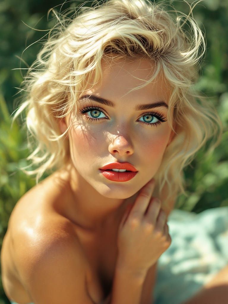 A 1950s pin-up woman with tan lines and big brown eyes plays barefoot in a park. The image features a fusion of photographic composition and glitch art with digital distortion and tonal shifts.