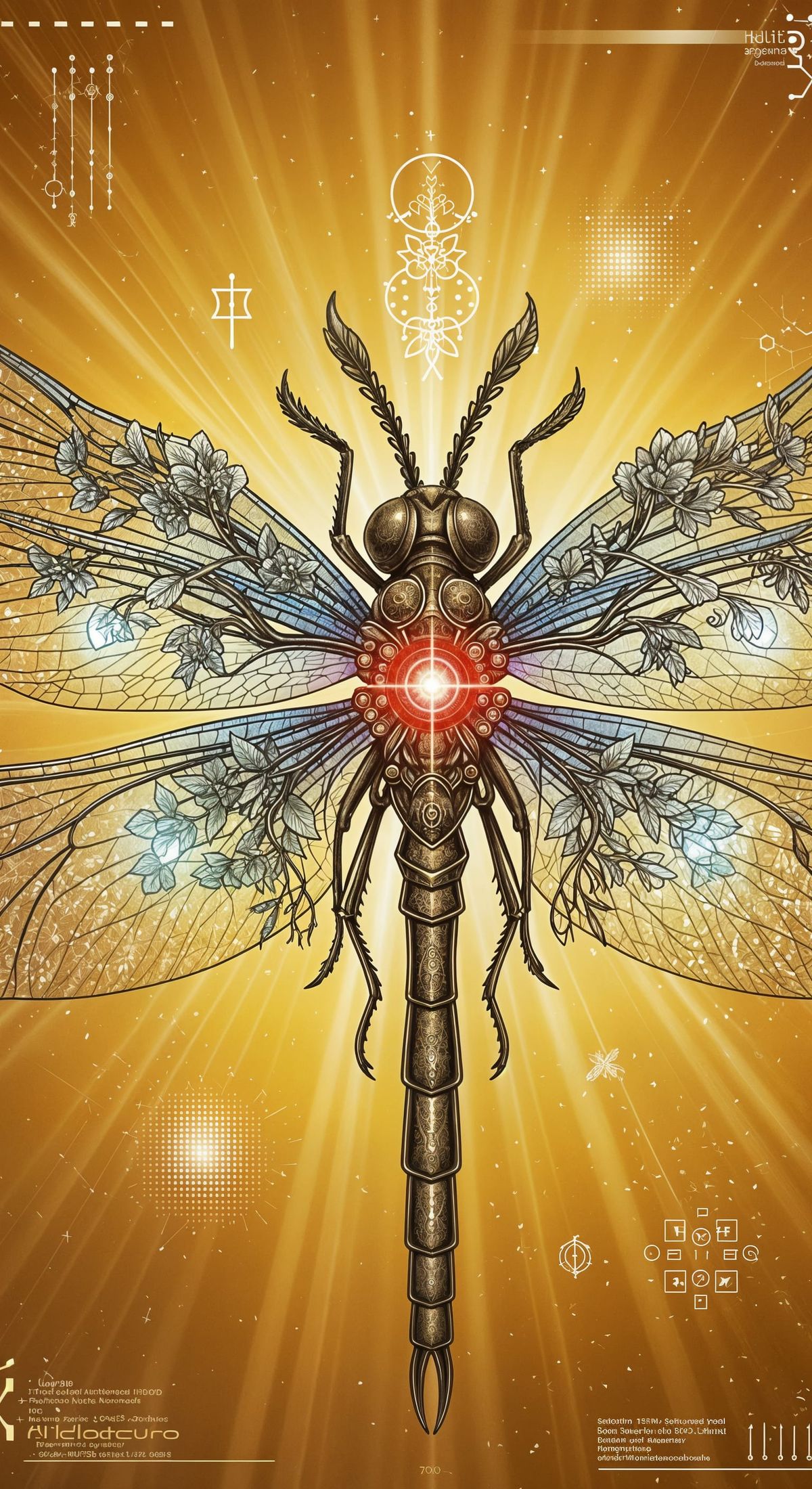 A striking picture of a cybernetic dragonfly with botanical wings. The insect's metallic body glows with a red core, hovering over a humanoid figure intertwined with roots and data fragments in a biomechanical style.