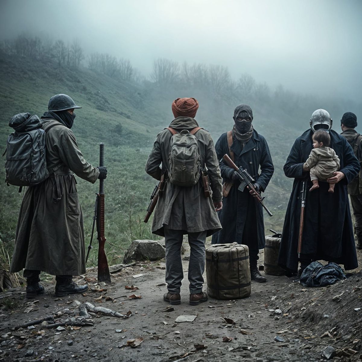 This image shows a group of masked travelers resting in a dystopian, foggy landscape. They carry weapons and protect a child, evoking a surreal and dark horror atmosphere.