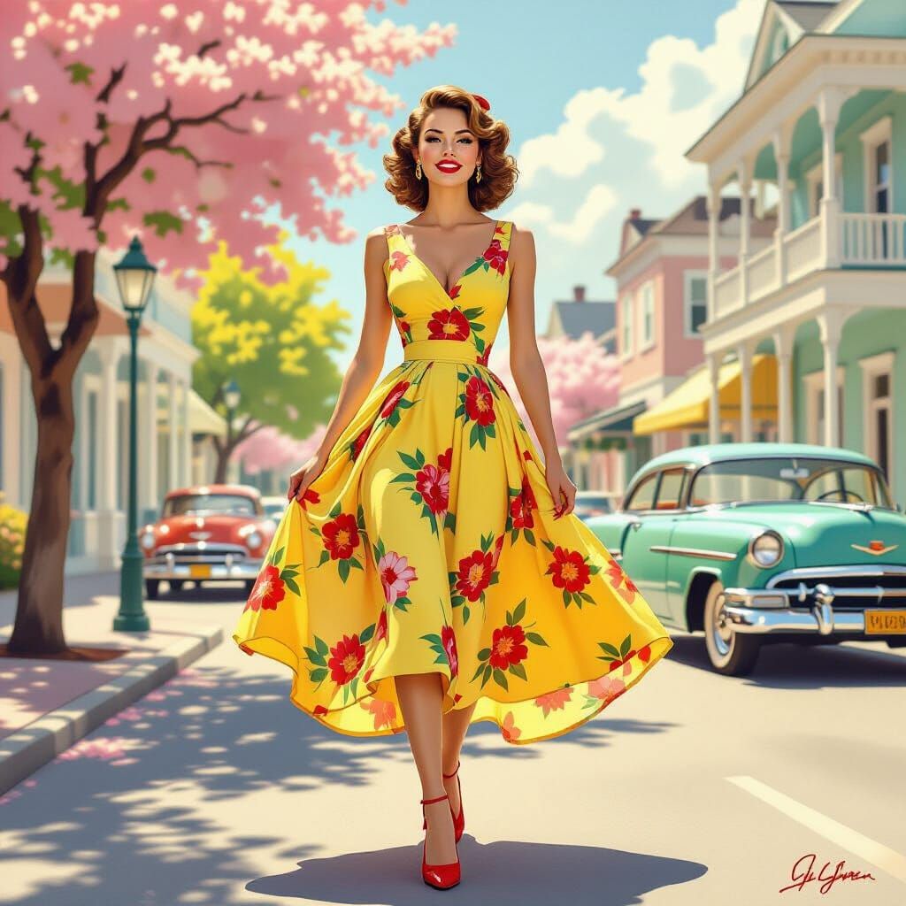 A vibrant image of a woman in a vintage dress walking down a sunlit street. This picture captures a nostalgic summer atmosphere with pastel buildings and classic cars, reminiscent of pin-up art.
