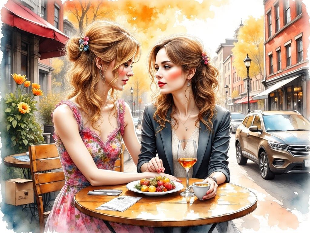This image shows two women in an outdoor cafe in downtown Boston. One woman in a floral dress comforts another in a skirt-suit, rendered with expressive ink lines and soft watercolor textures.