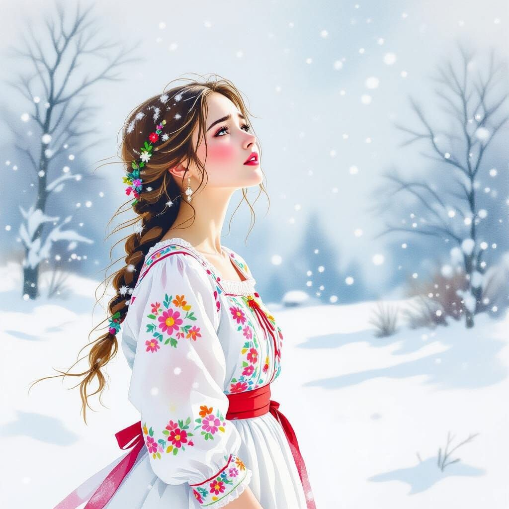 A delicate watercolor of a young Ukrainian woman in traditional dress braving a blizzard. The soft, luminous colors and fairy-tale style evoke feelings of fear and sadness.