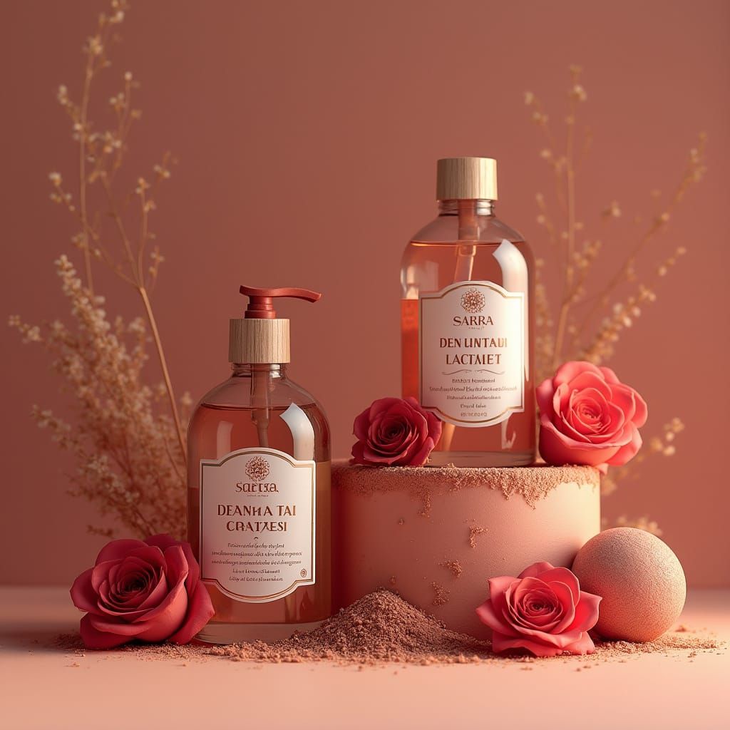 A detailed matte painting shows a vibrant basket filled with Moroccan products: natural soap, henna, rose water, cream, and an exfoliating glove. The image features deep colors and intricate details, in a fantasy concept art style.