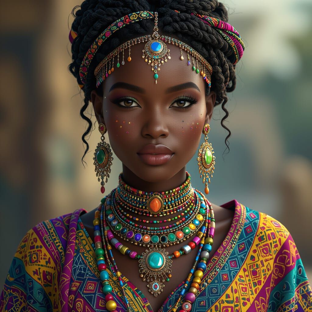 This hyperrealistic digital artwork showcases a Munyankole woman adorned in vibrant, detailed attire and innovative jewelry. Rendered with deep colors and intricate detail, it features a fantastical concept art style.