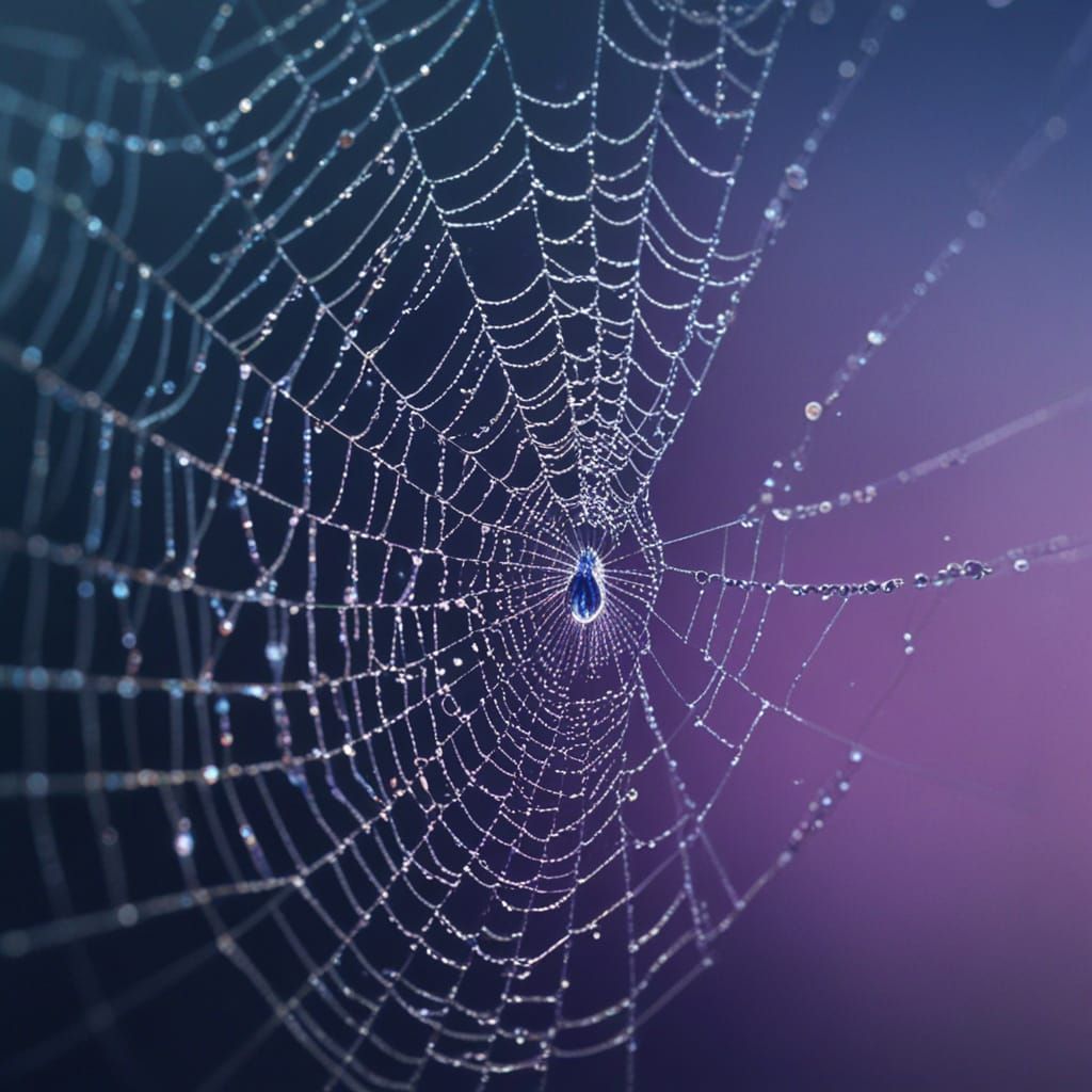 A striking picture of a dewdrop on a spiderweb reflecting a nebula. The close-up image captures the delicate web threads and a bokeh background in ethereal photography style.