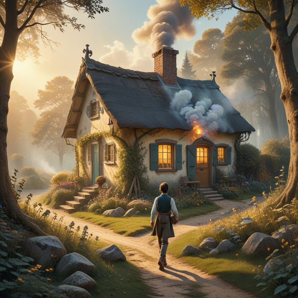 This enchanting illustration depicts a small cottage with smoke rising, a person knocking on the door, and polished shoes. The scene is bathed in warm, golden light, with soft brushstrokes, muted colors, and subtle textures creating a dreamy atmosphere. The image features intricate patterns and natural s...