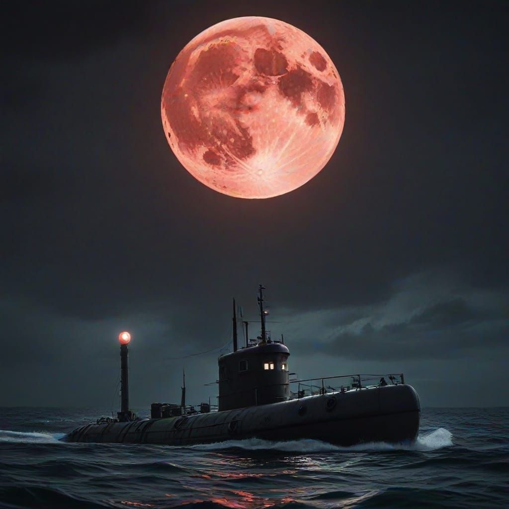 This image shows a haunting World War 2 vintage submarine lurking in the Devil's Sea beneath a dramatic blood moon, creating a mysterious and eerie atmosphere.