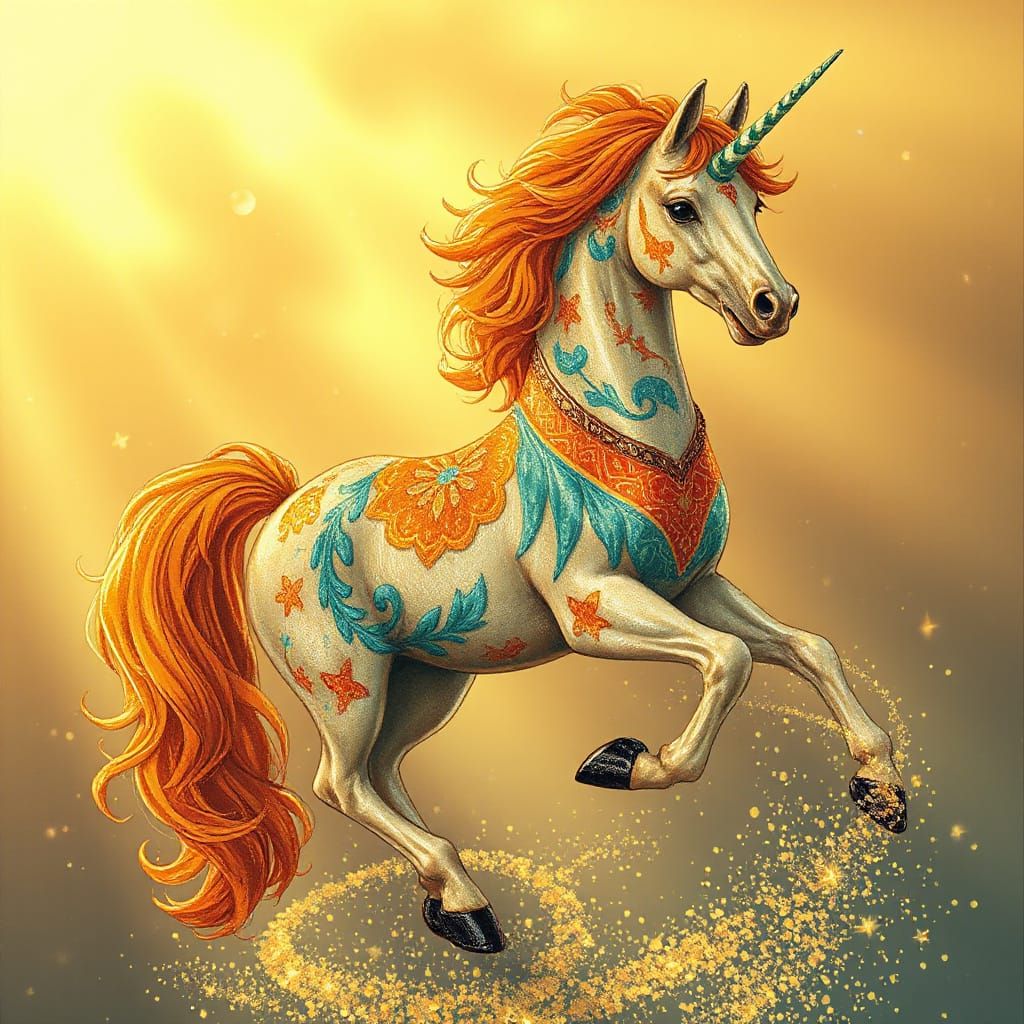 This image showcases a majestic unicorn with a shimmering stardust trail, detailed with vibrant orange and teal majolica patterns. The scene is bathed in an ethereal golden hour glow, presented in a whimsical illustrative style.