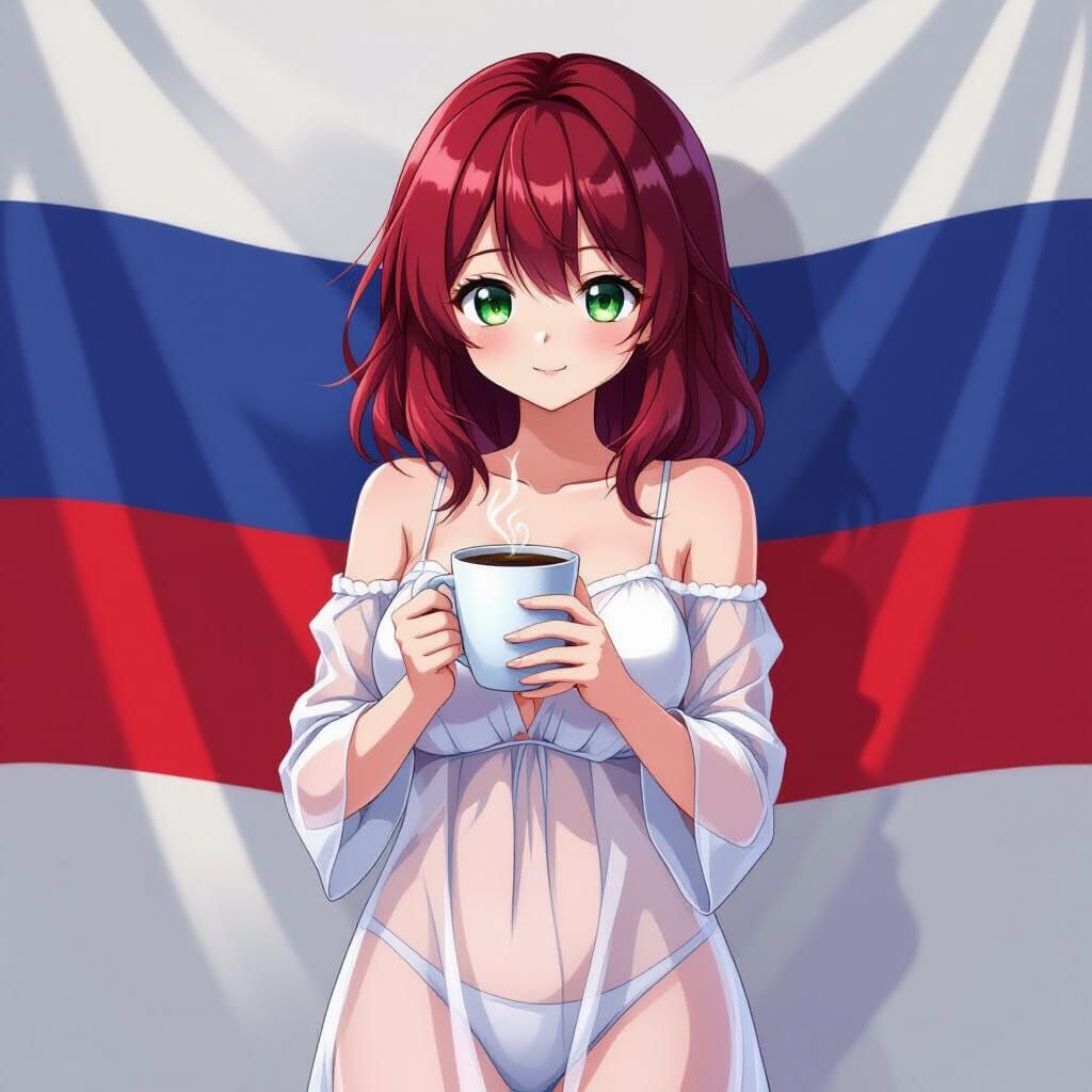 This image shows a cute anime-style woman with crimson hair and green eyes in a white nightgown. She is holding a pet coffee against a Russian flag backdrop, rendered in vibrant, saturated colors.