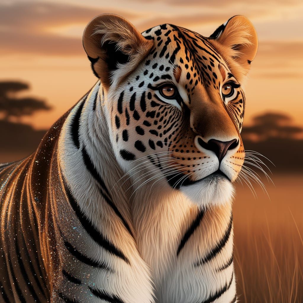 A digital painting of a lioness with fractal patterns and embossed textures on her fur, set against a golden savanna sunset. The artwork features airbrushed details and a warm color palette.