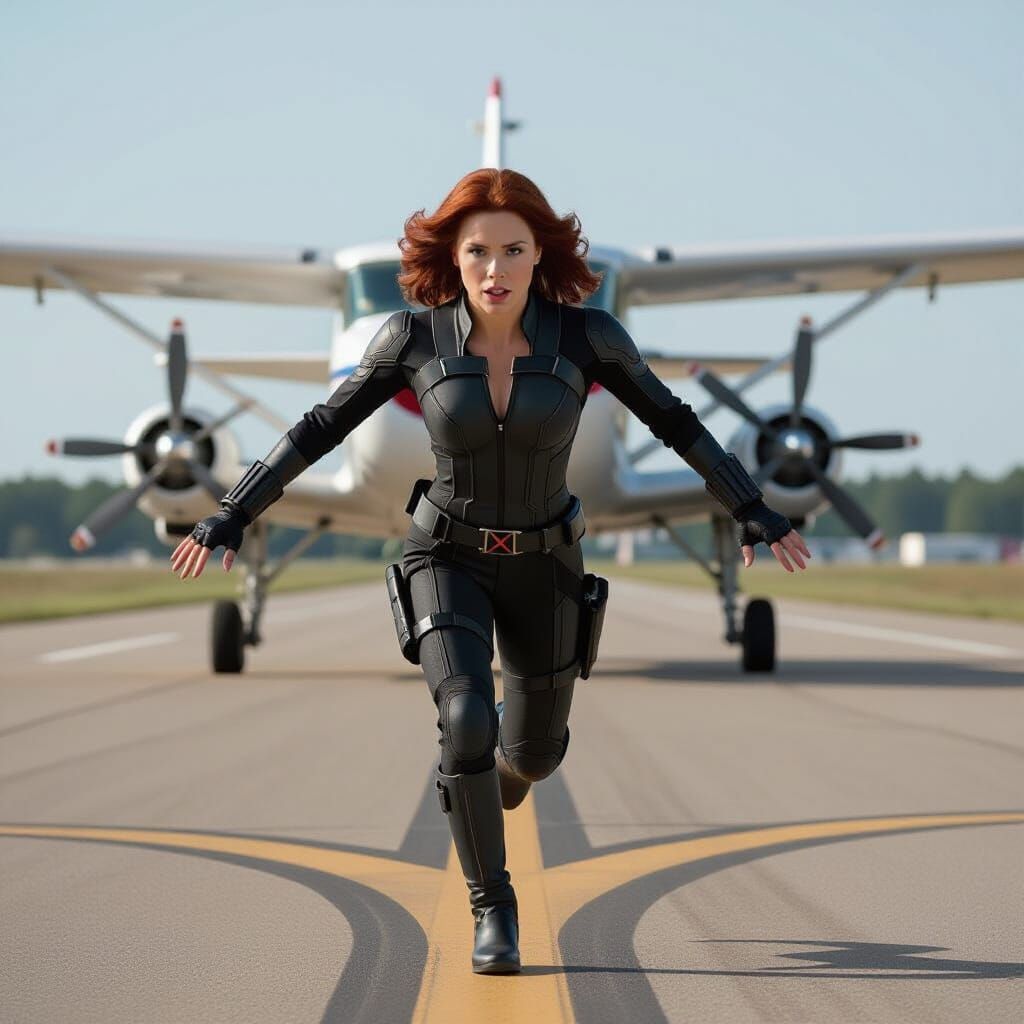 This image shows a super heroine resembling Black Widow running towards a jet on a runway. She jumps to grab the wings with a determined look, in a dramatic, epic, cinematic style with film grain.