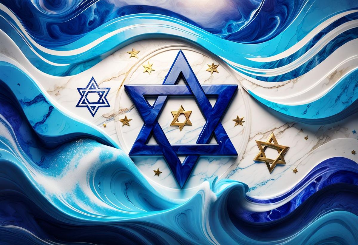 A vibrant digital painting of colorful, swirled marble with a textured white background. An Israeli flag featuring the Star of David is prominently displayed in the center of the composition. The artwork is richly detailed.