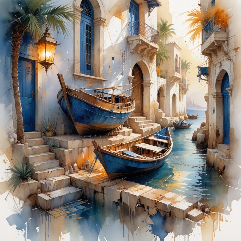 A vibrant image capturing a coastal medina at twilight. Earthy ochres and deep cobalt blues define the architecture, reminiscent of warm oil pastels and watercolour techniques, with North African ambiance.