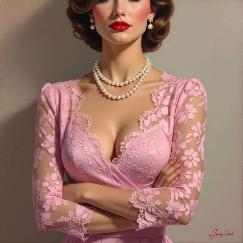 A realistic image of a woman in a pink lace dress with pearls. She stands confidently with folded arms, projecting a dominant presence in a photorealistic style.