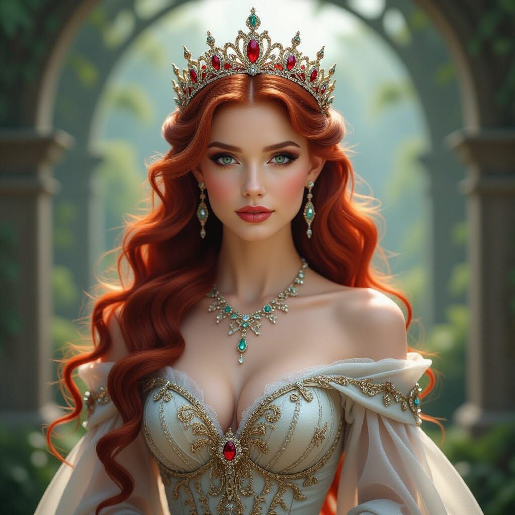 This photorealistic image depicts a majestic elven queen of wonderland in a detailed, expensive gown and a jeweled crown. The art style features delicate textures and refined features.