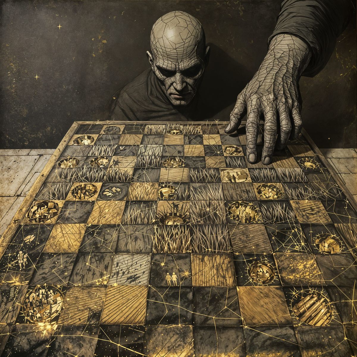 A poignant artwork featuring a weathered farmer standing on a chessboard of rice paddy fields, blending with the board's surface in a stunning display of kintsugi-like artistry. The piece is infused with a sense of introspection and the passage of time.
