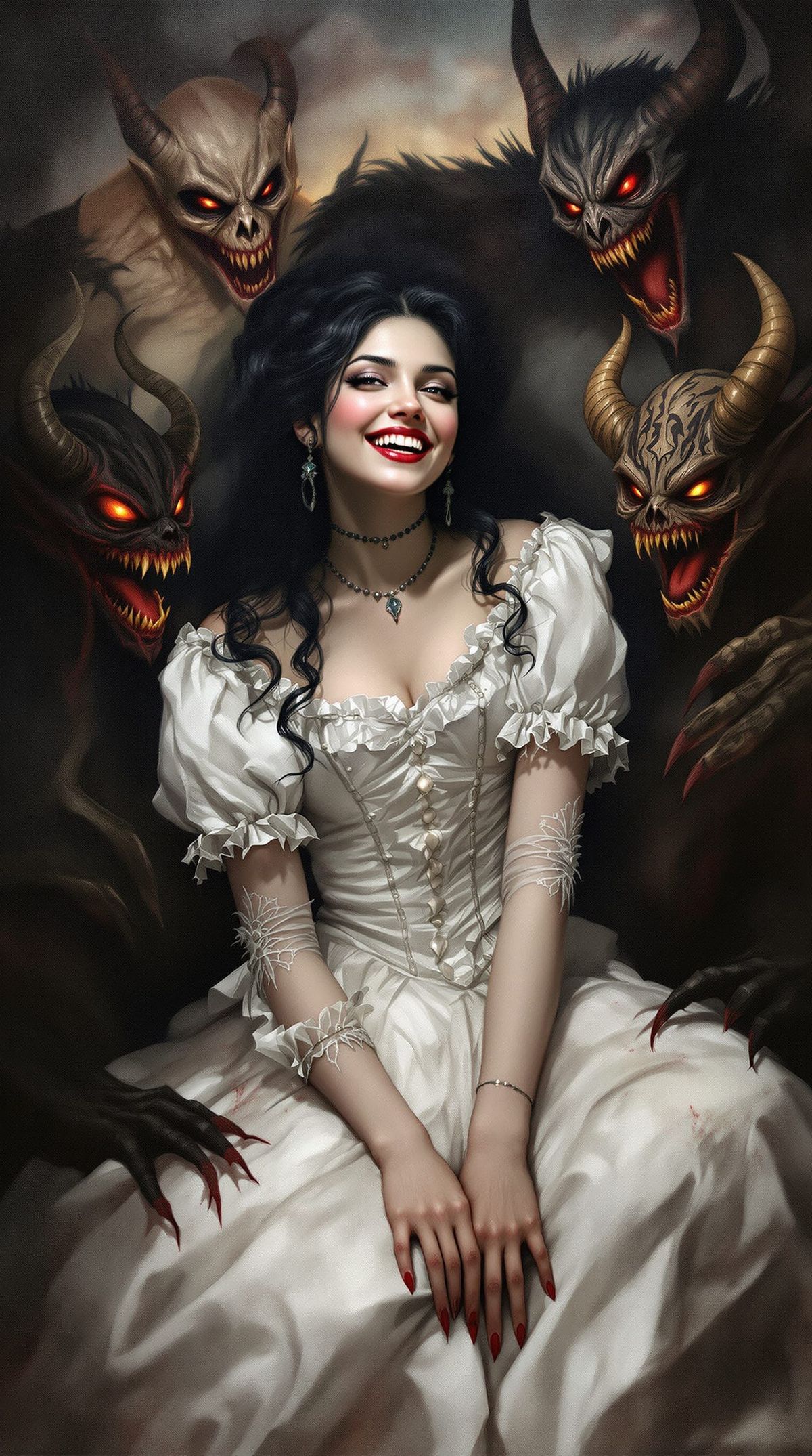 This image shows a cheerful girl in a Victorian dress encircled by menacing monsters. The oil painting evokes a dark fairytale fantasy with its contrasting themes.