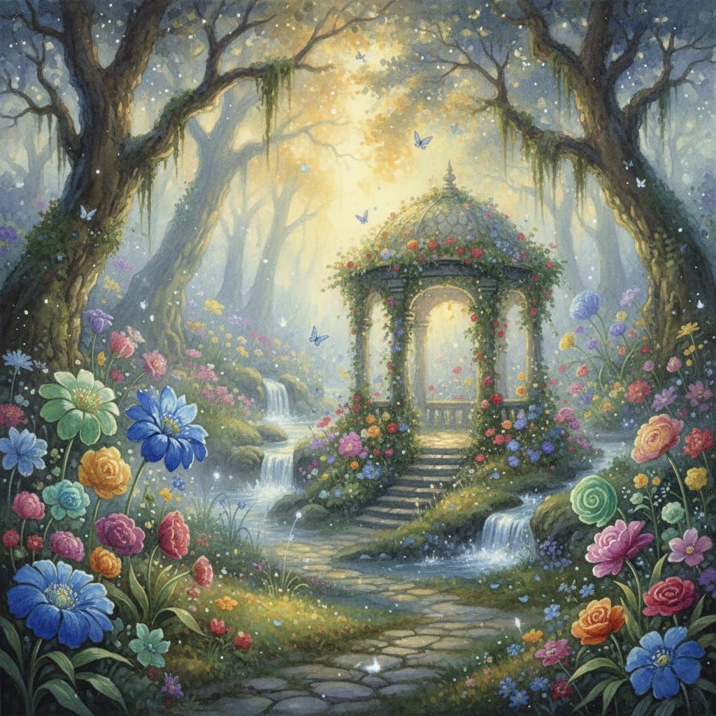 This image showcases a secret flower garden enveloped in ethereal, hyperdetailed mist, rendered in a watercolor style reminiscent of Thomas Kinkade.