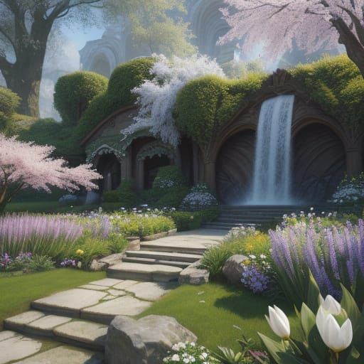This image shows a woman with long white hair in a lush spring garden. The artwork features intricate details and complementary colors, rendered as fantasy concept art.