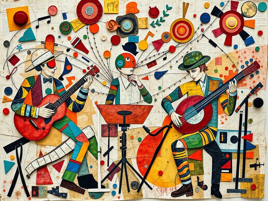 This image shows a dynamic and dreamlike scene of musicians in a cubist collage, surrounded by swirling paper scraps, fabric fragments, and found objects in a kaleidoscope of colors, with vibrant and textured brushstrokes reminiscent of surrealist and abstract expressionist art.