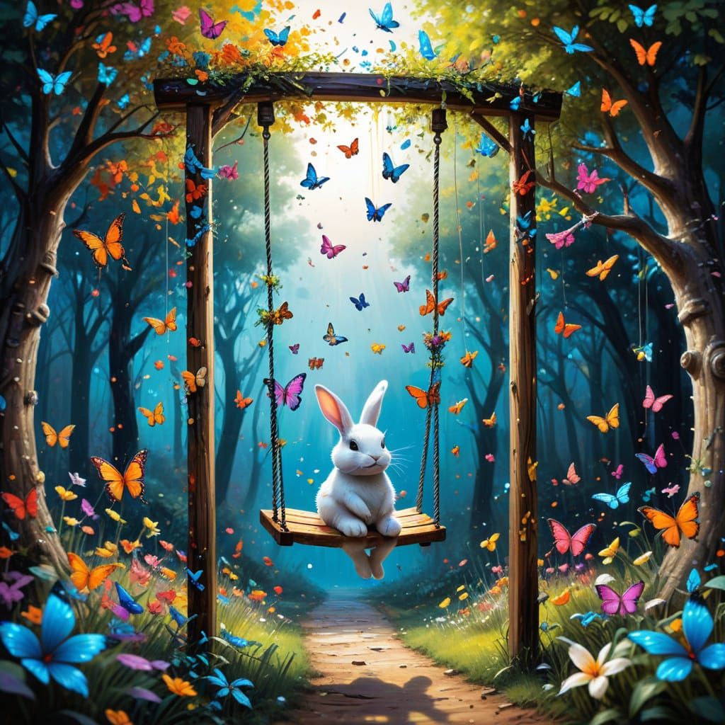 A vibrant graffiti art style illustration of a whimsical garden featuring a round wooden house. A bunny on a swing and colorful butterflies enhance the playful, ultra-detailed scene.