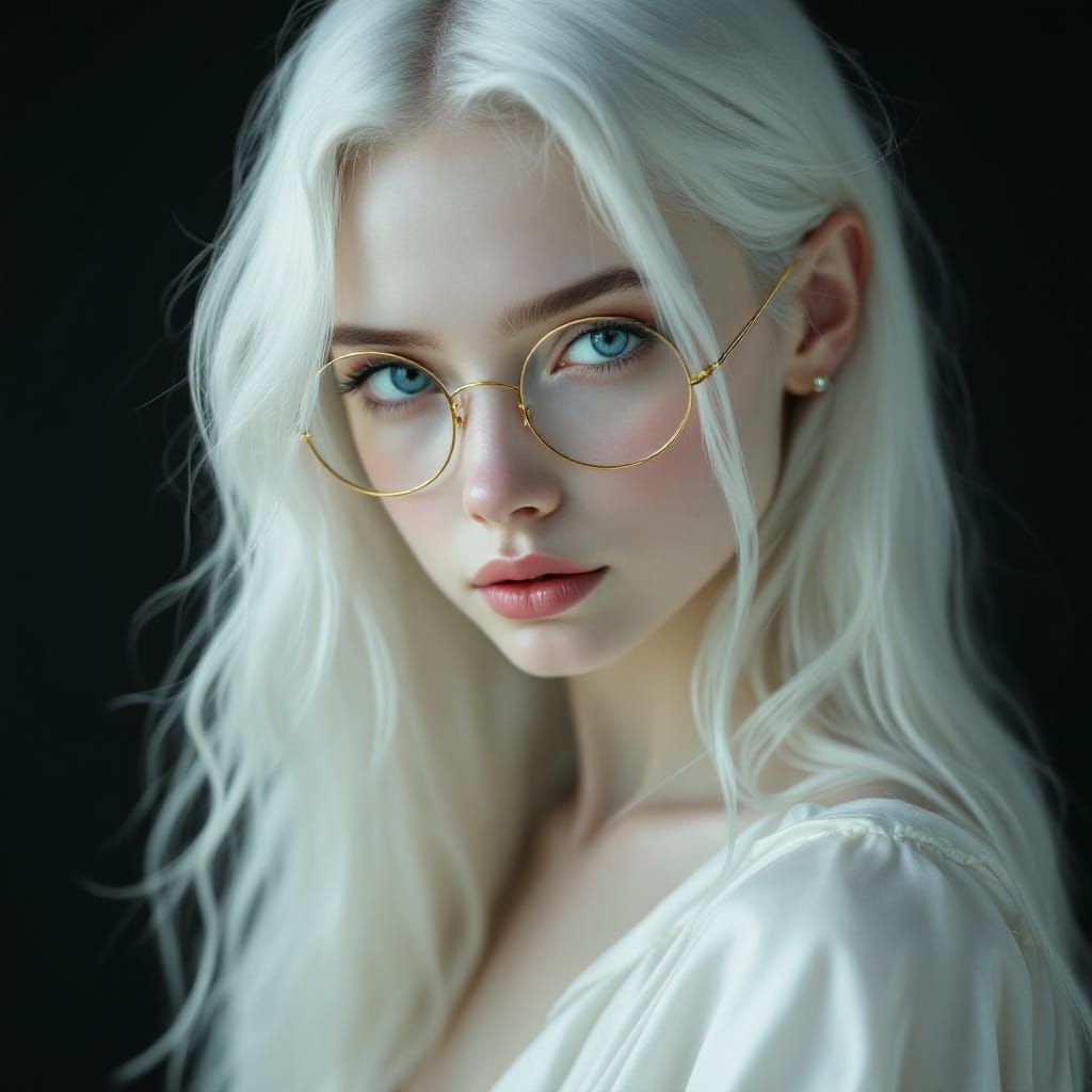 A captivating image of a serene albino woman in a flowing white silk dress, exuding quiet intensity and enchanting subtlety, reminiscent of the Pre-Raphaelite movement with delicate textures and an ethereal quality