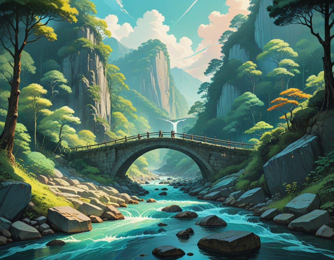 (A stone bridge over a flowing river) forest mountain background; ; vivid summer sky; Cinematic fantastical manga style watercolor painting; (Hiroyuki-mitsume Takahashi, Anton Fadeev, Victo Ngai and Ismail Inceoglu:1.3); vibrant pastel color palette; fantasy concept art; (ray tracing; volumetric lighting) ...