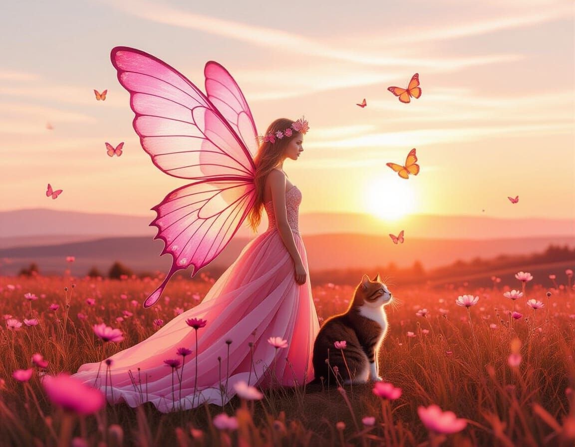 This image shows a double exposure of a fairy with large wings and a cat. The fantasy landscape is filled with flowers and butterflies in pink and orange hues.