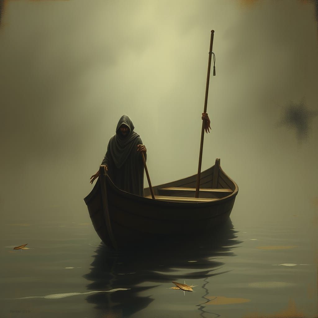This image depicts a ferryman standing in a wooden boat, surrounded by an eerie misty atmosphere, on the river Styx, with a subtle, dreamlike quality reminiscent of Symbolist art.