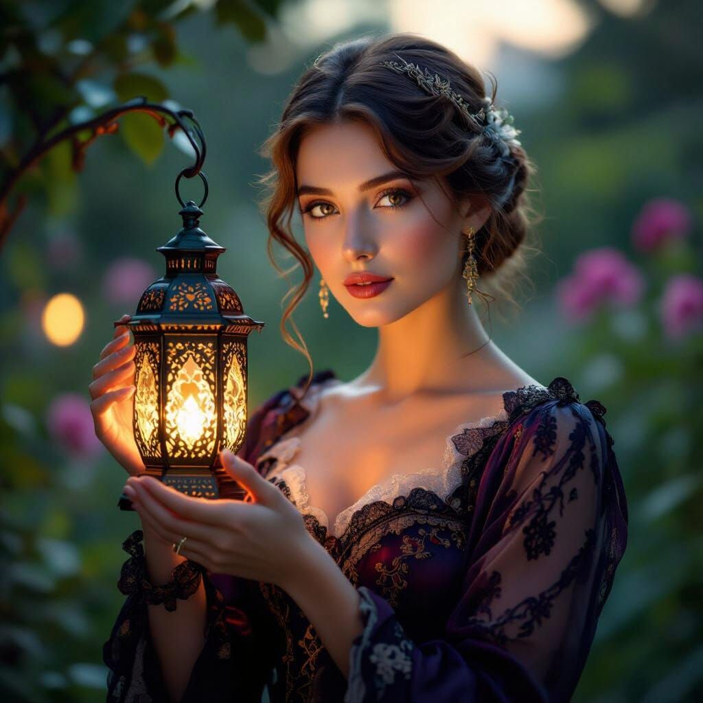 A vintage-style portrait of a beautiful woman with timeless elegance, holding a delicate, ornate lantern that casts a warm, ethereal glow. Her attire is reminiscent of the early 20th century, with intricate lace details and deep, rich colors. The background is a softly blurred garden scene, hinting at ...