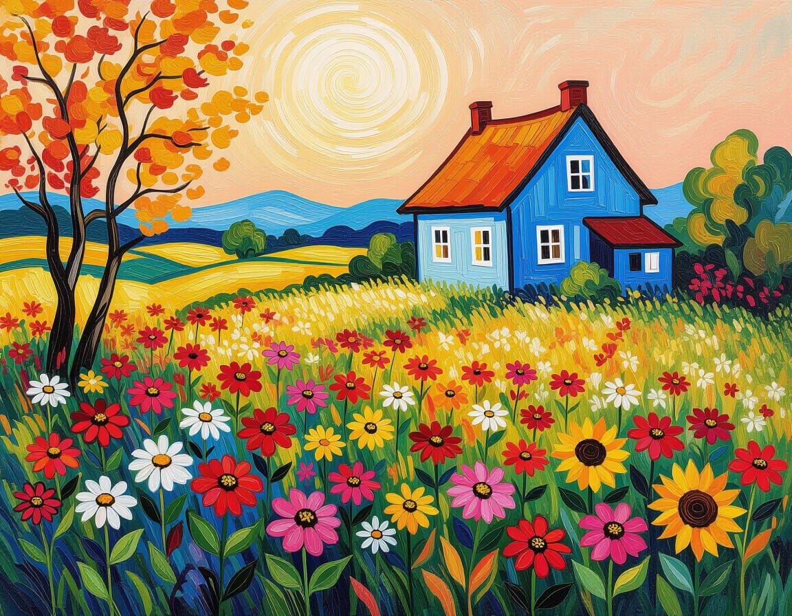 This image depicts a charming cottage garden with a blue house, overflowing with colorful flowers. Rendered with thick, swirling oil brushstrokes, it captures a warm, vivid palette and dynamic natural beauty.